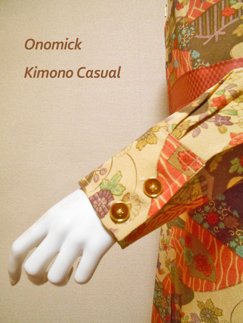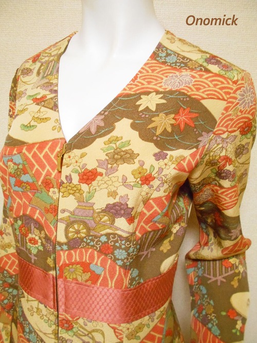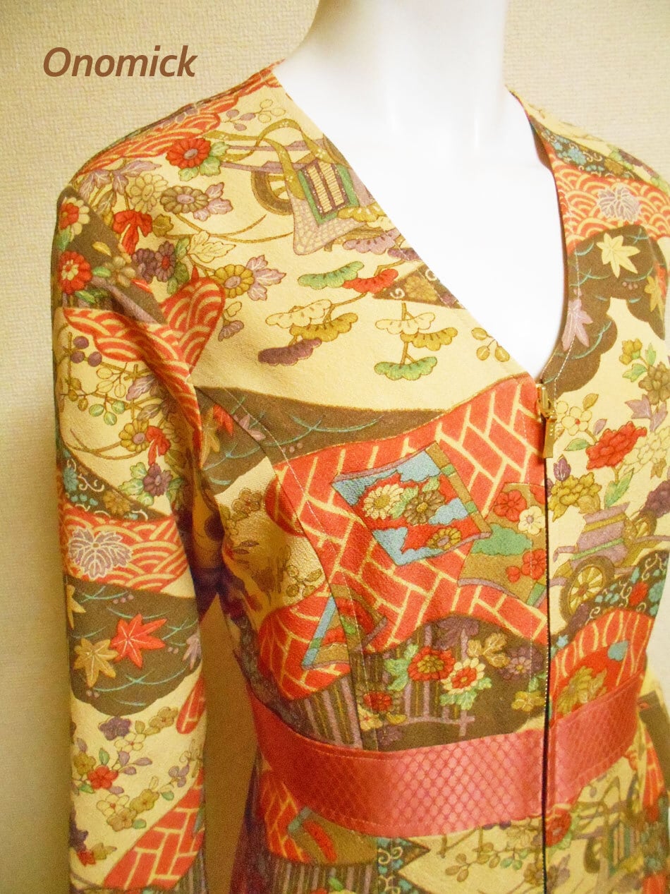 オノミックの作品は古い着物や羽織り、帯を再利用して仕立てています。年代相応の使用感や生地によっては薄ジミや折りジワ、焼けムラなどある場合が御座いますが、どうしても使わなければならない場合があることをご理解頂き、日本の古い素材をお楽しみ頂ければ幸いです。