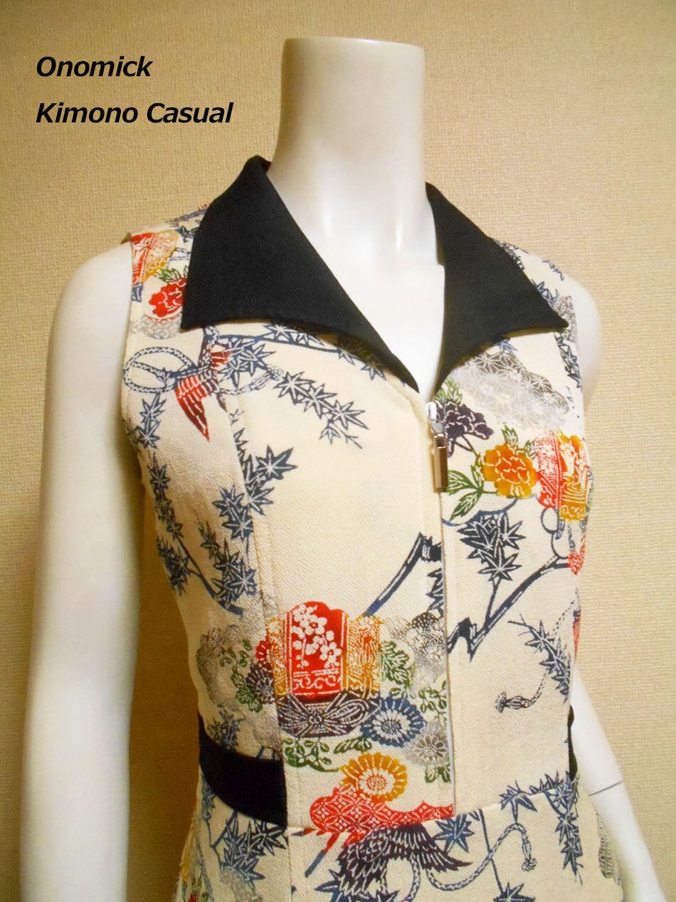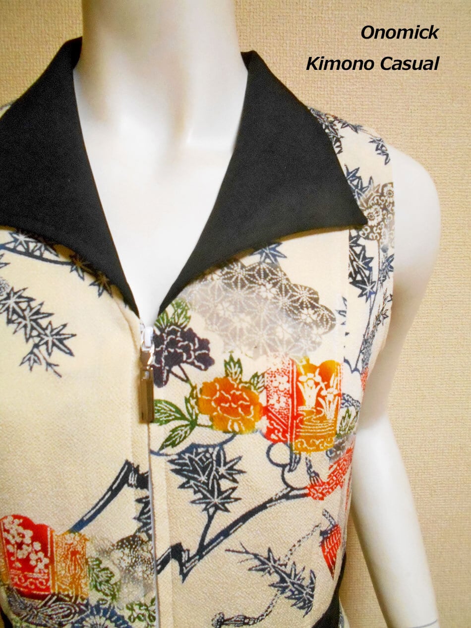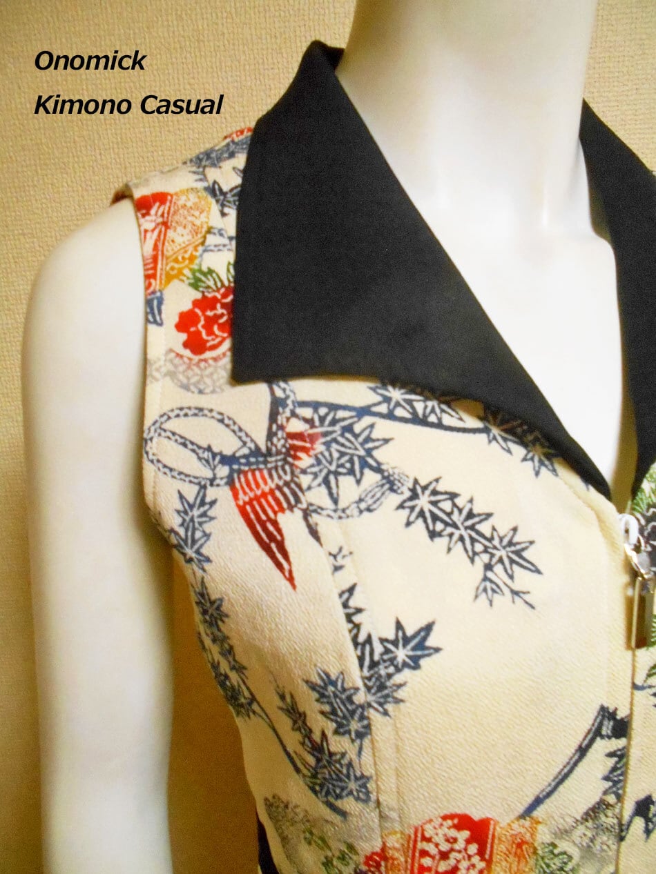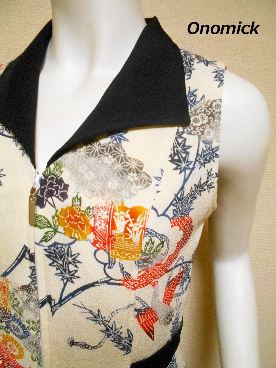 オノミックの作品は古い着物や羽織り、帯を再利用して仕立てています。年代相応の使用感や生地によっては薄ジミや折りジワ、焼けムラなどある場合が御座いますが、どうしても使わなければならない場合があることをご理解頂き、日本の古い素材をお楽しみ頂ければ幸いです。